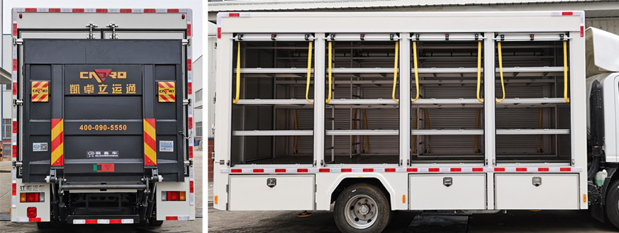JDF5100XZBQ6型裝備車由底盤、液壓搭橋(尾)板、器材箱等組成,內(nèi)部設置隔間,可根據(jù)運輸設備的外形尺寸及特點固定、安裝,用于后勤保障,向一線輸送特種裝備。該車系選用慶鈴汽車股份有限公司生產(chǎn)的QL1110ANKAY二類汽車底盤改裝而成,原裝單排駕駛室,可載含駕駛員在內(nèi)的乘員3人,駕乘舒適輕便。該車用于消防救援隊裝備運輸,兩側(cè)卷簾門,車尾安裝搭橋板或1噸垂直升降液壓尾板,搭橋板主要用于機器人上下車廂;貨物可通過液壓圍板上下車,內(nèi)部根據(jù)轉(zhuǎn)運器材的結(jié)構(gòu)進行鋁合金器材架的搭建,該車最大的特點是操控性好、維修簡便,可廣泛應用于應急消防隊、公安、醫(yī)療衛(wèi)生、廠礦企業(yè)及社區(qū)、碼頭等場所。